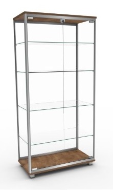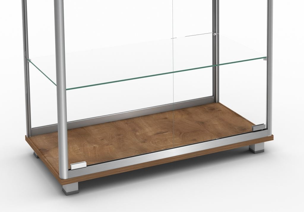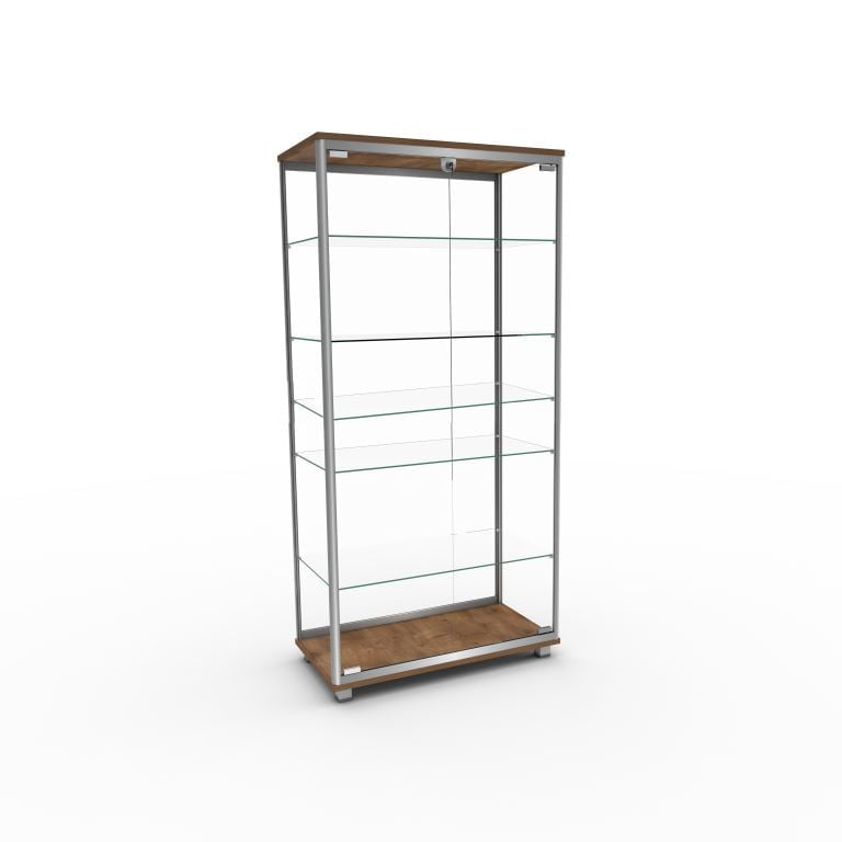 Solidna konstrukcja opiera się na aluminiowym profilu anodowanym na kolor srebrny, który gwarantuje stabilność całej konstrukcji, podtrzymywanej dodatkowo przez stopki stabilizujące umieszczone w podstawie. Wnętrze witryny zostało wyposażone w cztery regulowane półki wykonane z wytrzymałego szkła hartowanego o grubości 6 mm, umożliwiające wygodną aranżację prezentowanych przedmiotów.
