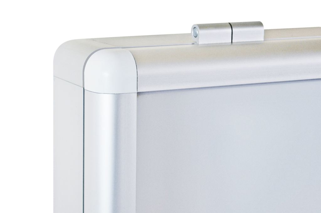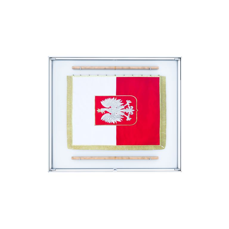 Produkt umożliwia pełną ekspozycję sztandaru i jednocześnie chroni go przed zabrudzeniem oraz uszkodzeniem. Gablota wisząca ma uchylne drzwi z pleksi, zamykane na kluczyk, co zabezpiecza przed dostępem osób niepowołanych. Rama z anodowanego aluminium łączona jest narożnie za pomocą zaokrąglonych, bezpiecznych głowic, co zwiększa estetykę i trwałość.